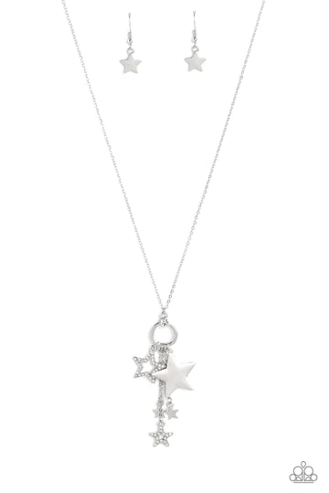 Starry Statutes - White Rhinestone Silver Star Cluster Long Necklace