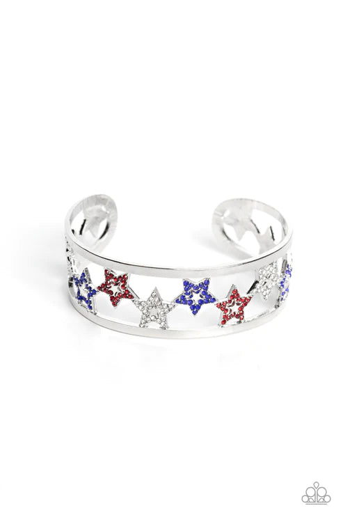 Starry Suffragette - Multi, Red, White, and Blue Rhinestone Stars Silver Cuff Bracelet
