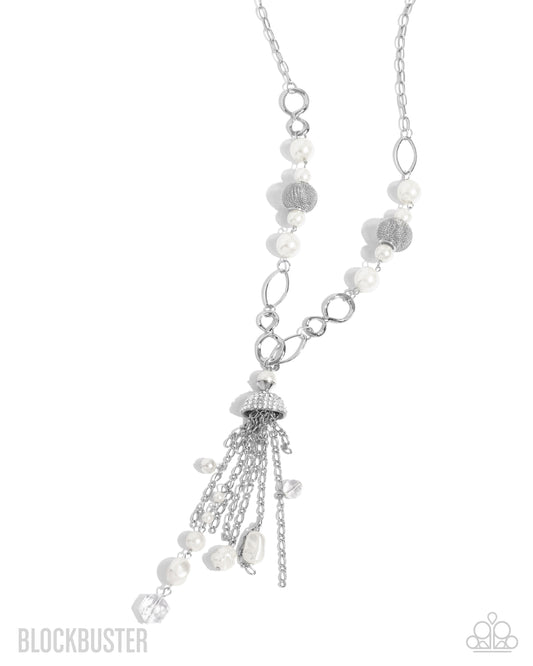 Designated Diva - White Rhinestone, Pearl, Tassel, and Crystal Y Long Necklace - Blockbuster