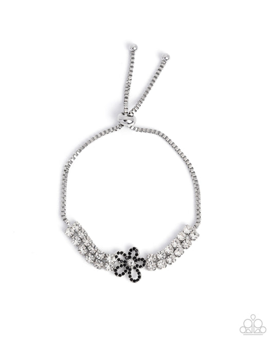 Blooming Breakthrough - Black Rhinestone Flower White Rhinestones Silver Box Chain Slide Knot Bracelet