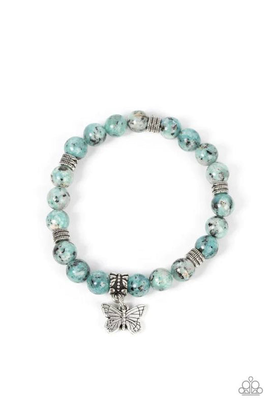 Butterfly Nirvana - Blue Stone Silver Butterfly Charm Stretchy Bracelet
