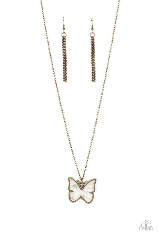 Gives Me Butterflies - Brass Clear Acrylic Butterfly White Flecks Short Necklace