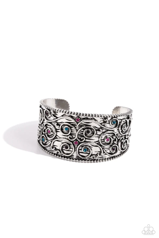 Billowy Beam - Multi Color Rhinestone Silver Flower Cuff Bracelet