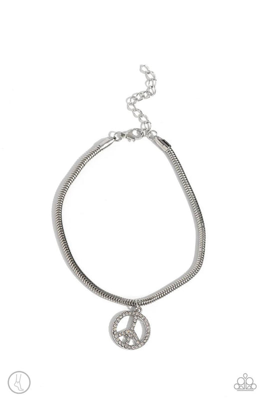 Pampered Peacemaker - White Rhinestone Peace Sign Silver Anklet