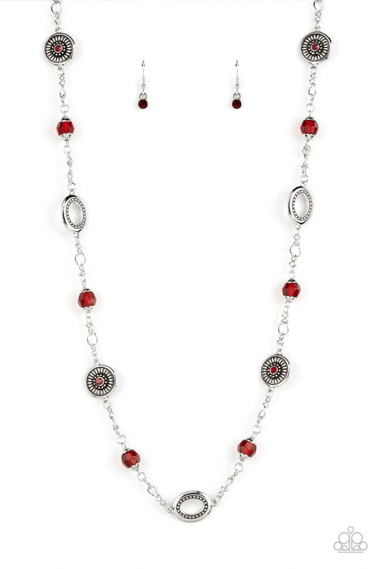 Glammed Up Goals - Red Rhinestone Silver Long Necklace