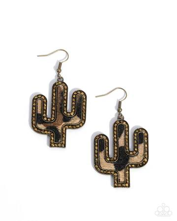 Western Worth - Brass Cactus, Cow-Printed, Aurum Rhinestones, Fishhook Earrings - Meet Your Match Exclusive