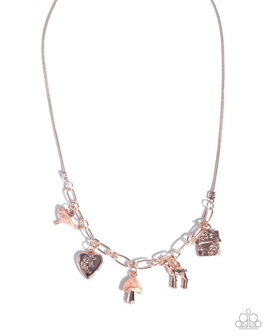 Fairytale Fanfare Necklace - Rose Gold Bird Cottage Mushroom Deer Heart Charms Pendant Paperclip Short Necklace