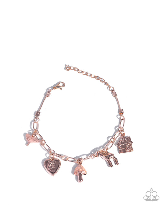 Fairytale Flourish Bracelet - Rose Gold Bird Cottage Mushroom Deer Heart Charms Paperclip Clasp Bracelet