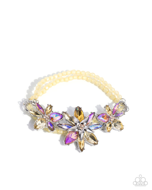 Floral Factor - Yellow Multicolored and UV-Shimmery Gem Flowers Peach Rhinestones Silver Clasp Bracelet
