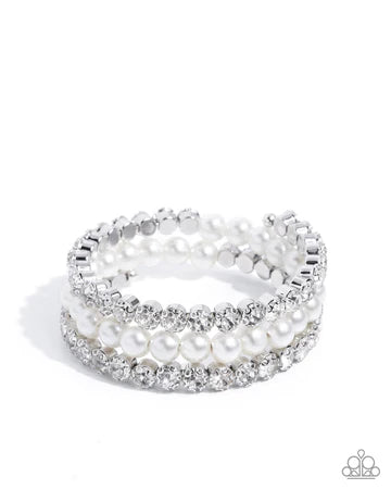 Grandiose Glitz - White Rhinestone Pearl Silver Coil Bracelet - Life of the Party