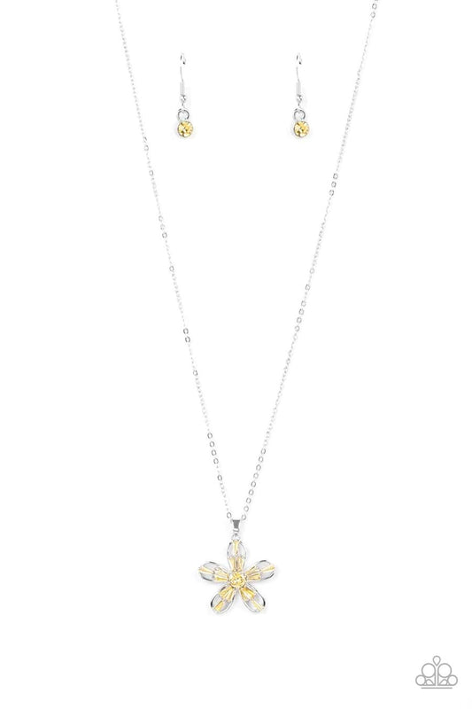 Botanical Ballad - Yellow Rhinestone Silver Flower Short Necklace