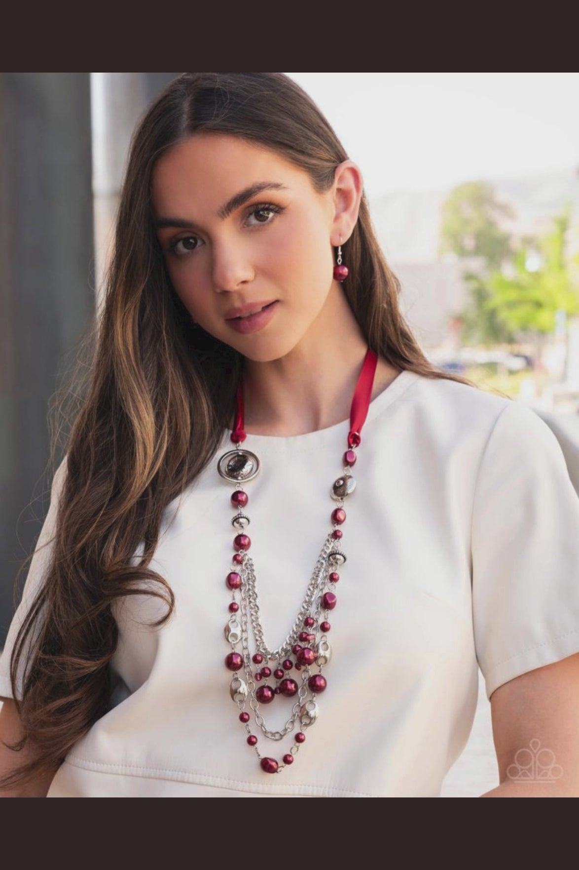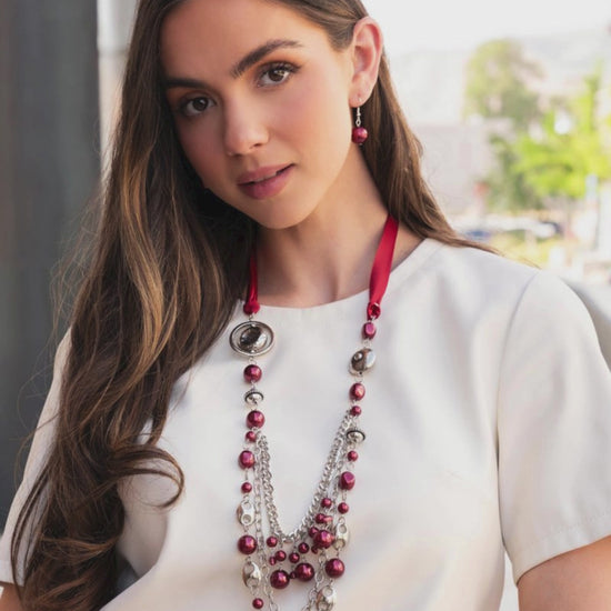 Replacing a traditional chain, a knotted, silky red ribbon gives way to jungle-inspired textured silver discs, glossy wine classic and baroque pearls, rope-textured silver beads, silver soda can-inspired tabs, silver cable chain strands, and chunky silver curb chain strands that cascade, intermix, and layer below the neckline for an opulent one-of-a-kind look. Sold as one individual necklace. Includes one pair of matching fishhook earrings.