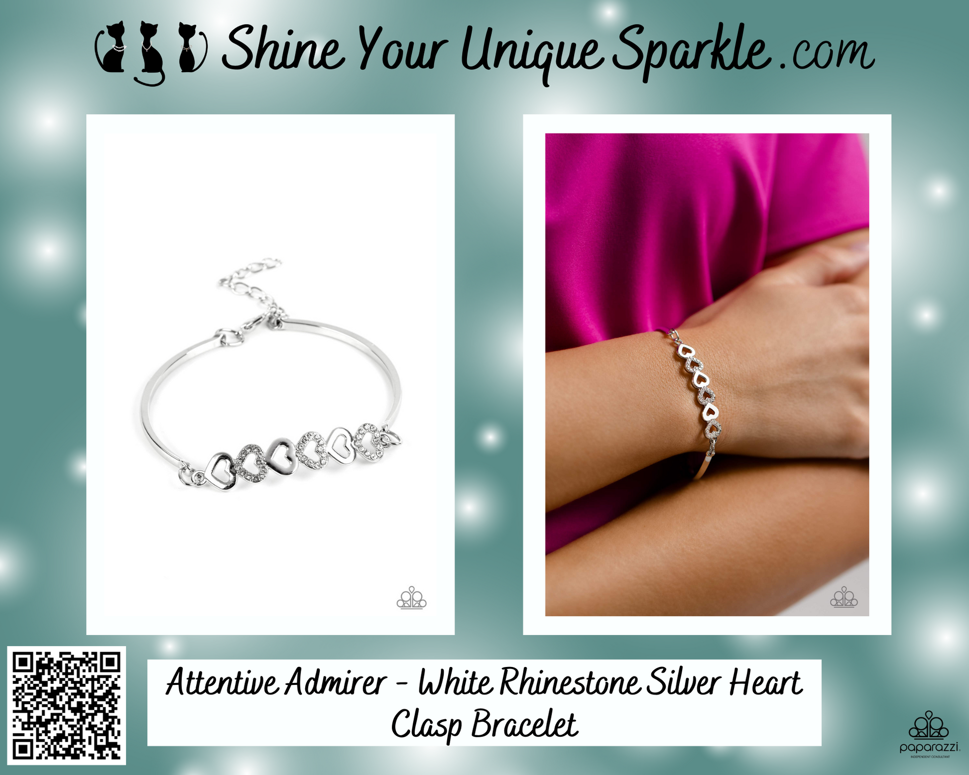 Attentive Admirer - White Rhinestone Silver Heart Clasp Bracelet