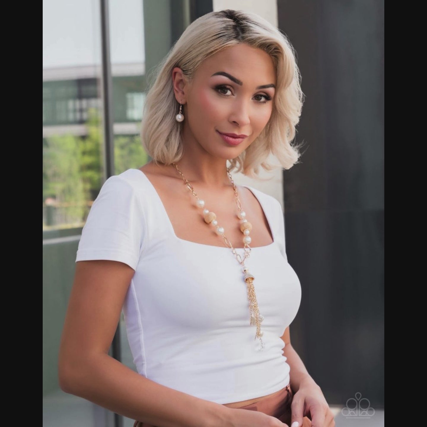 Designated Diva - Gold, Tassel, and Crystal, White Pearl Y Long Necklace - Blockbuster Exclusive