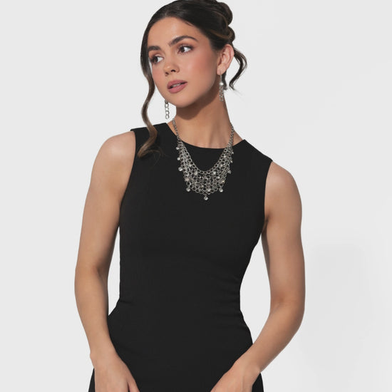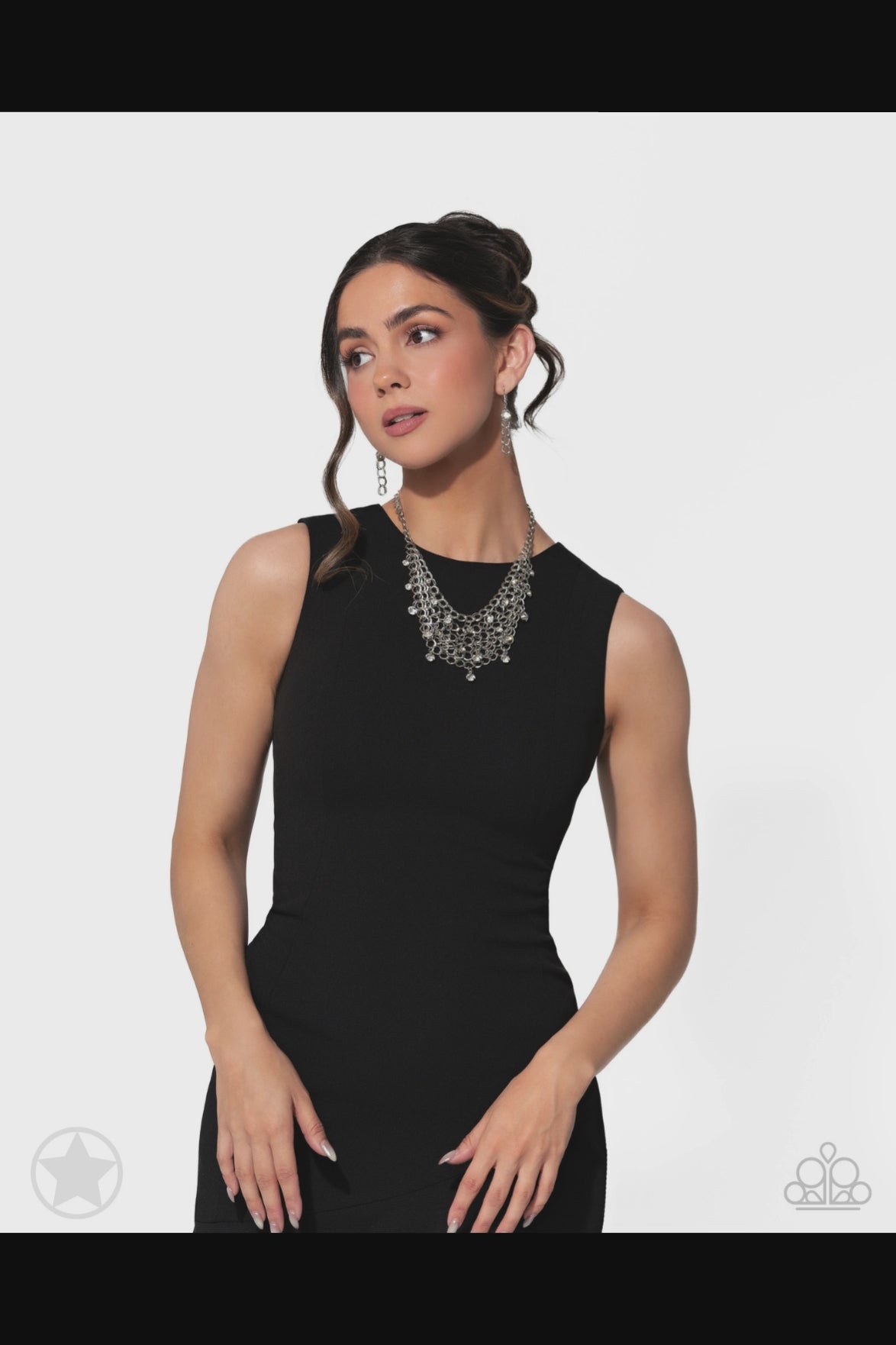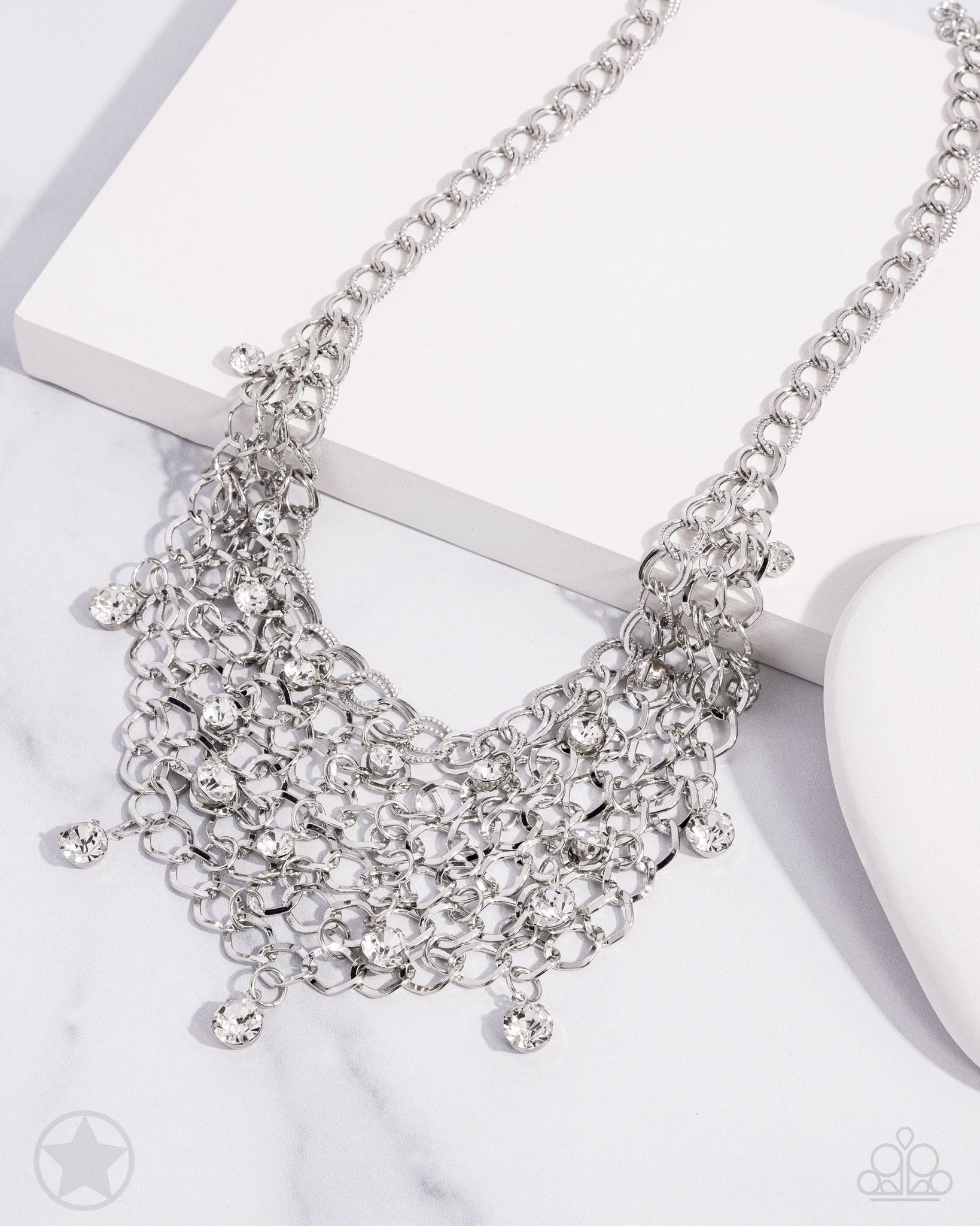 A collar of layered interlocking silver chain provides the canvas for gorgeous clear rhinestones to sway delicately. Features an adjustable clasp closure.Sold as one individual short necklace. Includes one pair of matching fishhook earrings. Intended for adult use.
