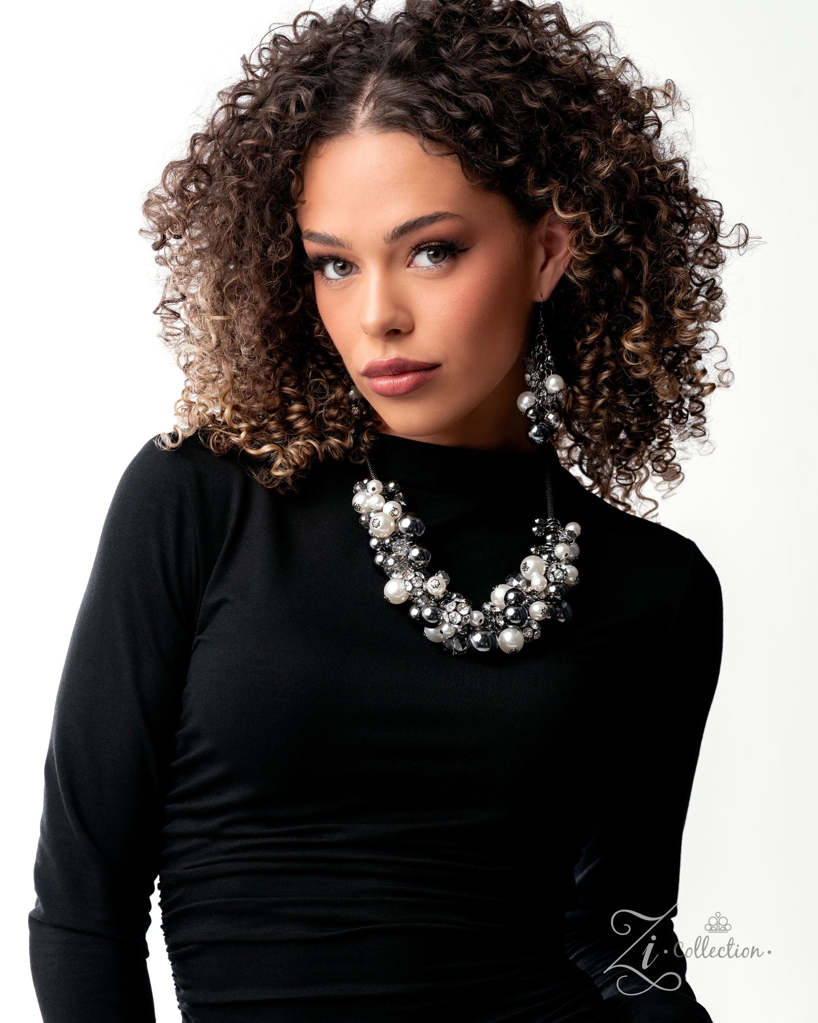 An attention-commanding collection of glossy gunmetal spheres, faceted smoky beads, glistening white pearls, sleek gunmetal rings, and rhinestone-encrusted gunmetal accents in varying sizes collide in a fierce explosion of texture and shine. Cascading below the collar along a bold gunmetal mesh chain, the dramatic clusters swing with an air of sophistication, while the multi-dimensional palette of shimmer and polish evokes a powerfully poised presence. Features an adjustable clasp closure. Sold as one individual necklace. Includes one pair of matching earrings. Intended for adult use.