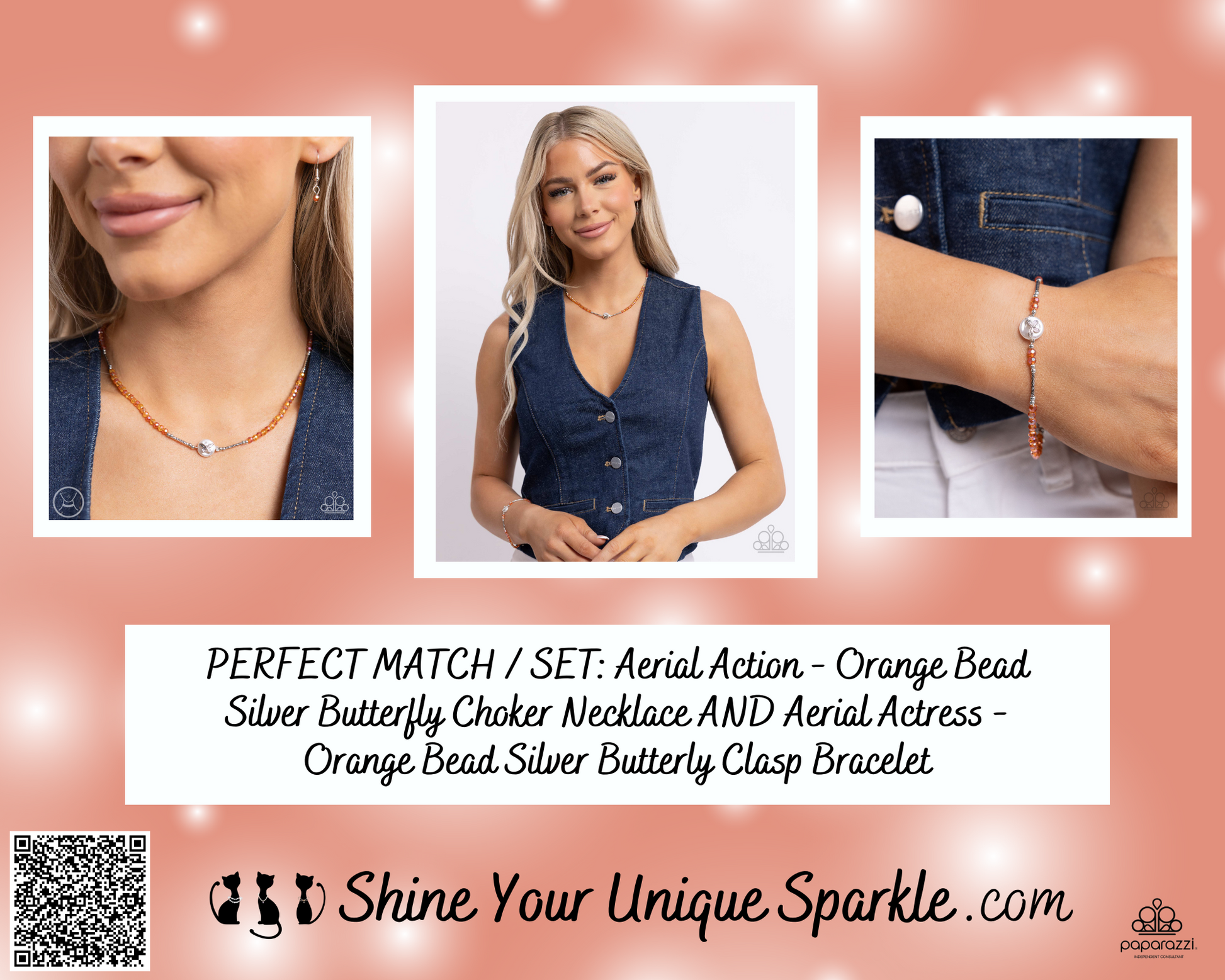 PERFECT MATCH / SET: Aerial Action - Orange Bead Silver Butterfly Choker Necklace AND Aerial Actress - Orange Bead Silver Butterly Clasp Bracelet