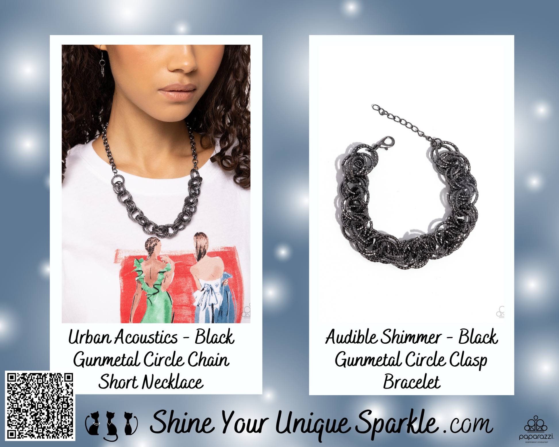 PERFECT MATCH / SET: Urban Acoustics - Black Gunmetal Circle Chain Short Necklace AND Audible Shimmer - Black Gunmetal Circle Clasp Bracelet