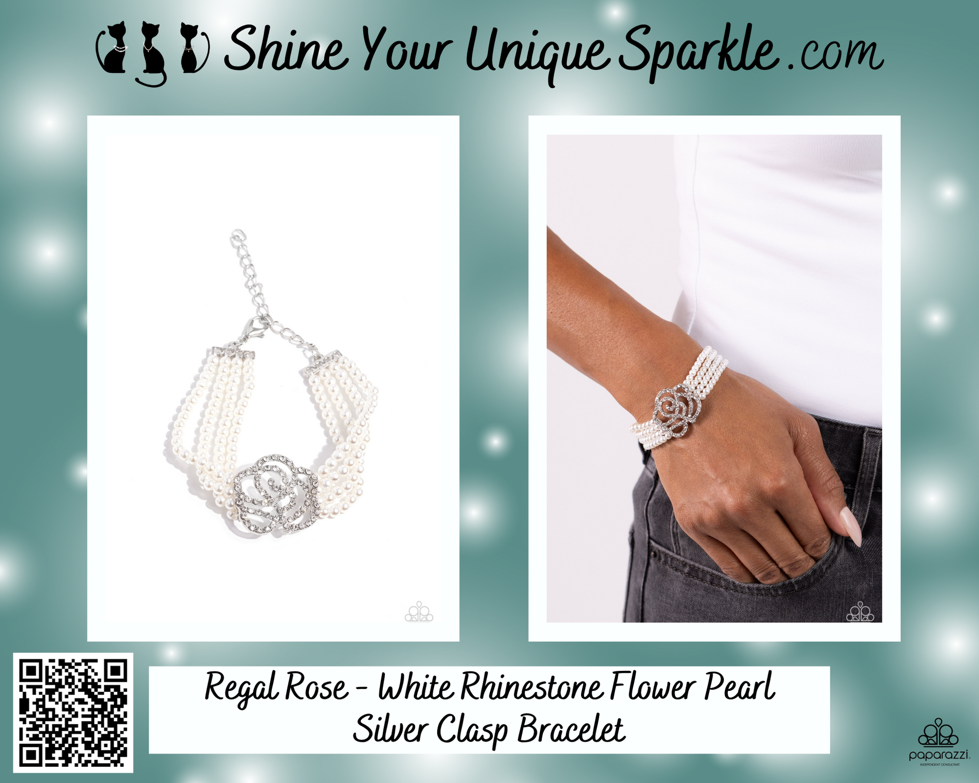 Regal Rose - White Rhinestone Flower Pearl Silver Clasp Bracelet