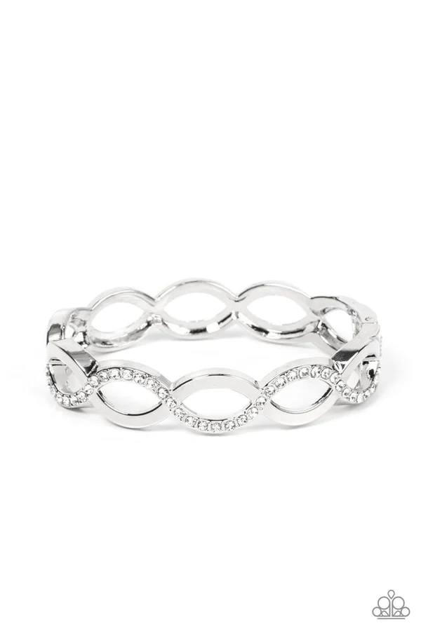 Silver bars elegantly intertwine into infinity inspired frames that delicately hinge around the wrist. The front of the flawless centerpiece is dusted in a wavy row of white rhinestones, adding a timeless twinkle to the versatile design. Features a hinged closure. Sold as one individual hinge bracelet.