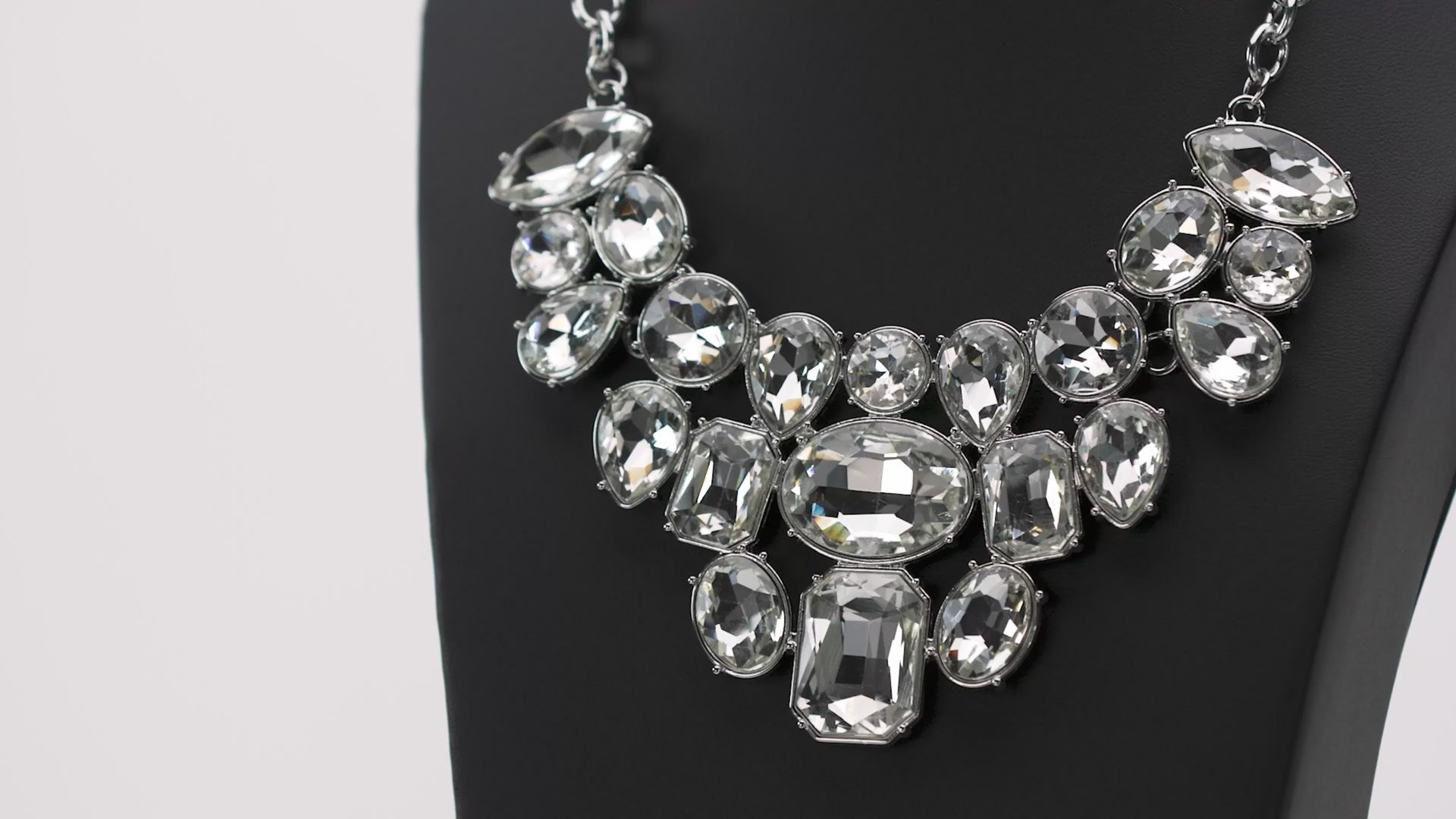 Encased in pronged silver frames, a collection of oversized marquise, round, oval, emerald, and teardrop shaped white gems blindingly coalesces into a jaw-dropping statement piece below the collar. At the center of the collision of shapes, an exaggerated oval gem stacks above a large emerald cut rhinestone, offering a gorgeous focal point. Sparkling marquises at each side of the scattered design connect the frames to a bulky silver chain, anchoring the dramatic display in a spectacular finish. Features an adjustable clasp closure. Sold as one individual necklace. Includes one pair of matching fishhook earrings.