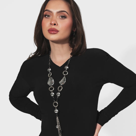 Long chain of black crystalized beads, curved plates of silver with a pearly finish, and chunky silver rings lead down to a tassel of chains and charms, including a crescent moon and a heart. Sold as one individual long necklace. Includes one pair of matching fishhook earrings. Intended for adult use.
