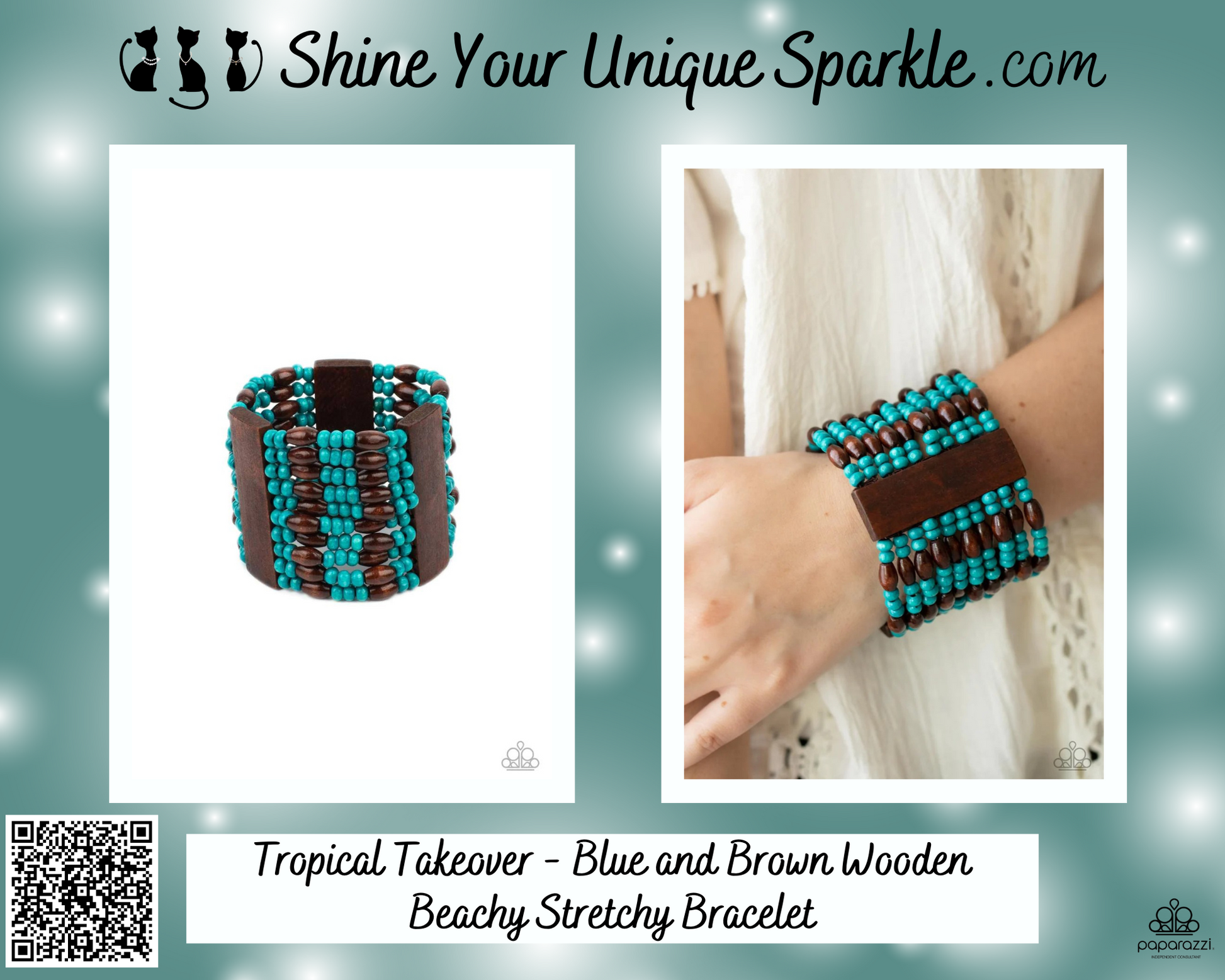 Tropical Takeover - Blue and Brown Wooden Beachy Stretchy Bracelet