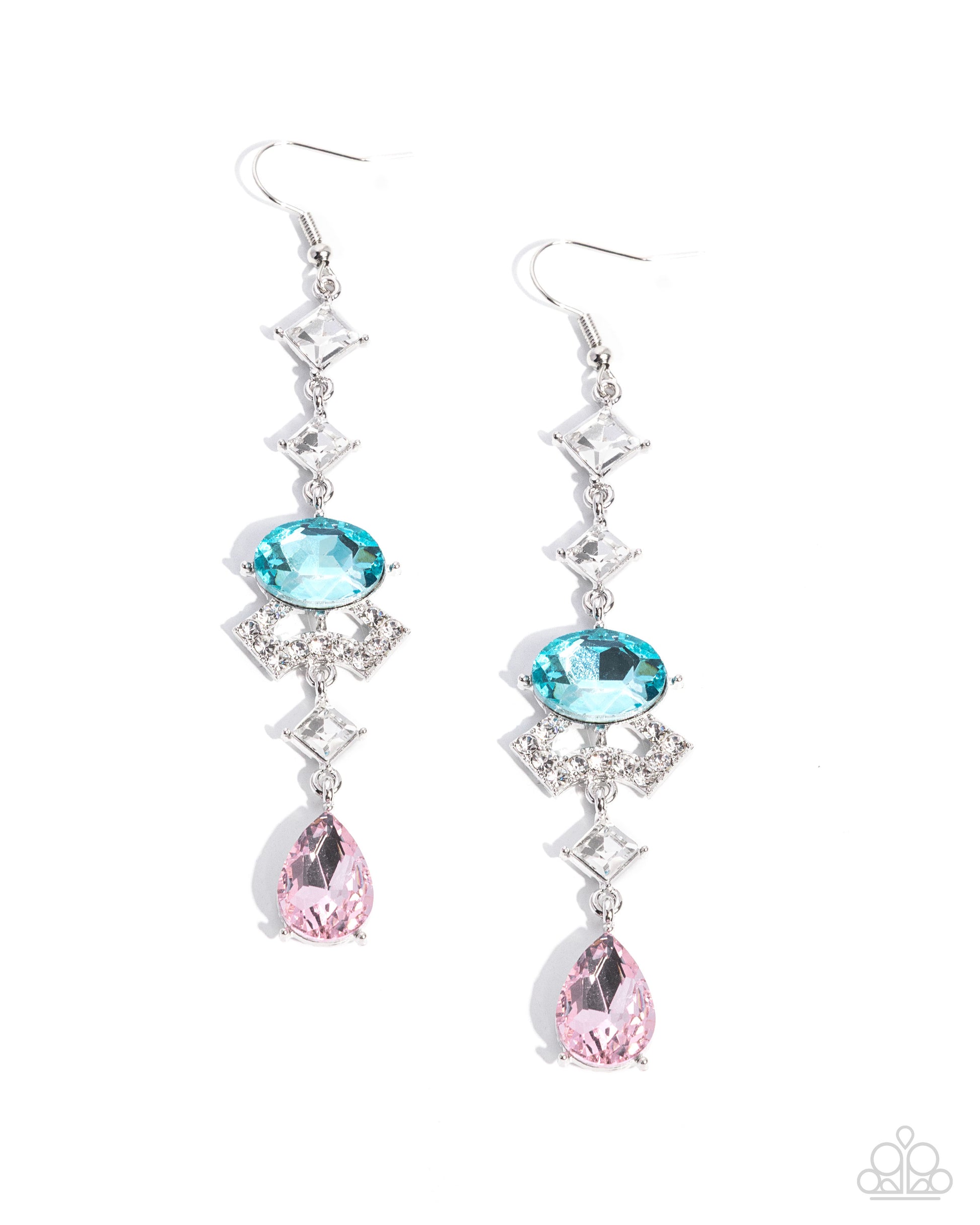 Square-cut white rhinestones link together to form an elegant vertical chain. A sparkling blue oval and a flared row of white gems add dazzling dimension, as a pink teardrop rhinestone glistens at the bottom for a final pop of color. Earring attaches to a standard fishhook fitting. Sold as one pair of post earrings. Intended for adult use.